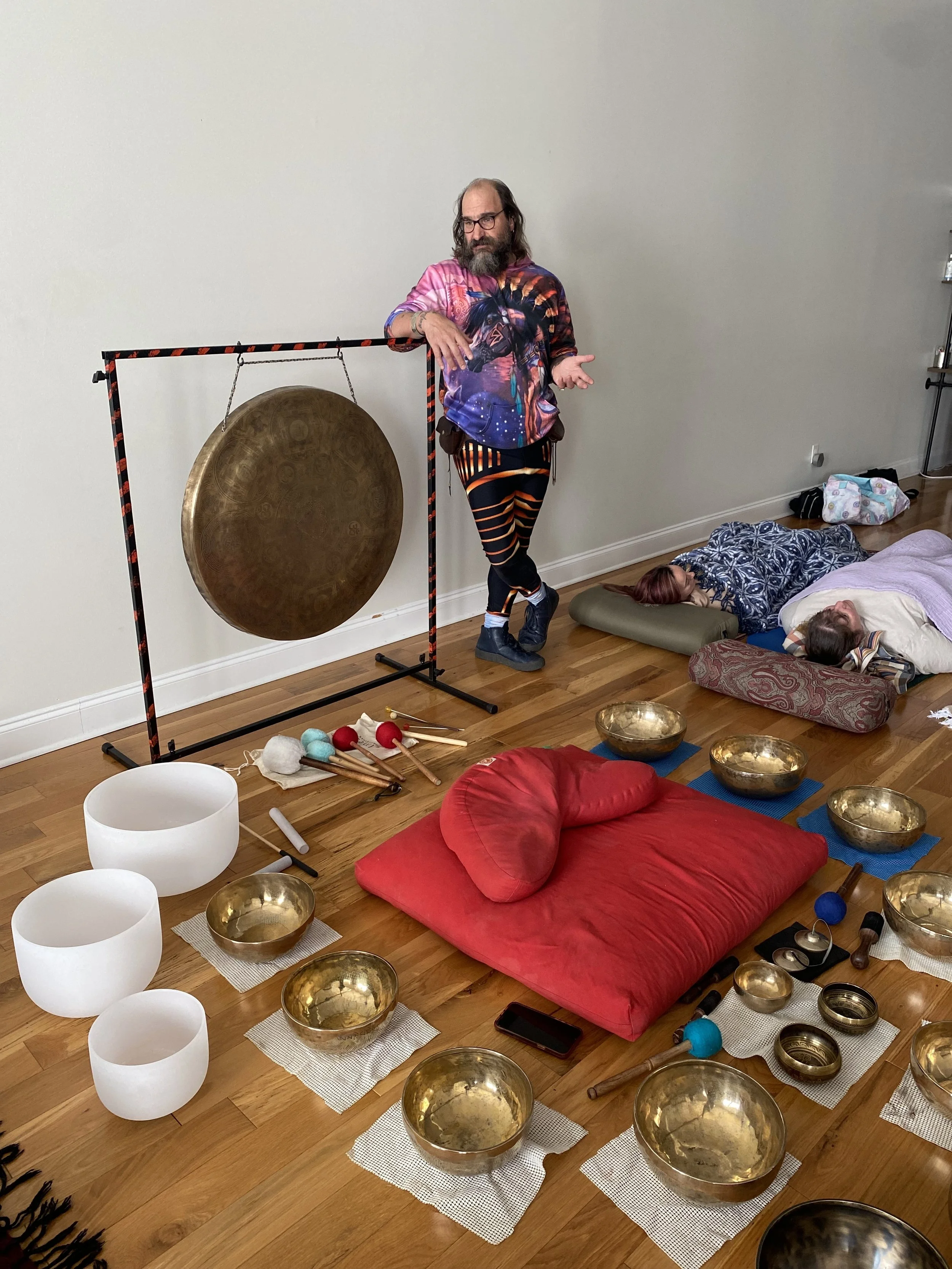 This takes place in our studio, in a group setting, while the sound bath washes over you. These high vibration sounds aid in the reduction of stress, anxiety, & insomnia.